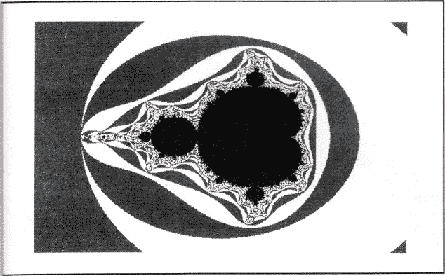 Eine Beispielausgabe ist im Listing 4 zu betrachten. Die vier vorgestellten Prozeduren kann man auch gut zu ziner relativ kompakten zusammenfassen, was auch der Geschwindigkeit zugute kommt. Eine Zusammenfassung für die Mandelbrot-Mengen ist im Listing 5 zu erkennen. Dieses Listing enthält im Gegensatz zu den anderen ein lauffähiges Programm! Bei welchen Koordinaten das "Grund”-Apfelmännchen zu finden ist, wurde schon angesprochen. Besonders schöne Ableger gibt’s beispielsweise an den Stellen, wo zwei größere Teile des Apfelmännchens zusammenliegen. Auch kleine Flecke, die recht unscheinbar irgendwo liegen, sollte man nicht verachten, denn gerade dort könnte sich ja eine Selbstabbildung der Mandelbrot-Menge befinden.