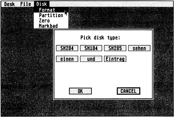 Im HDX.RSC wird zwar der Maskenaufbau bereitgestellt, doch die Texte für die Auswahl der verschiedenen Versionen werden nicht hier sondern im WINCAP eingetragen. Dadurch kann man jetzt auch so herrliche und unnütze Spielchen, wie sie im nebenstehenden Bild zu sehen sind, treiben. Sehen Sie sich im Ausschnitt des WINCAP die Modifizierung an und vergleichen Sie damit das Resultat im Programmablauf. Sie können hier bis zu 16 verschiedene Einträge vornehmen. Ich habe mir damit ein WINCAP geschrieben, in dem an dieser Stelle die verschiedenen Laufwerkstypen mit unterschiedlichen Formatangaben eingetragen sind. Das Beispiel hat aber noch keine Auswirkung auf die Formate selbst, dazu müssen noch weitere Parameter eingetragen werden.
