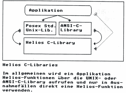 Auch die ANSI-C-Library wird zur Verfügung stehen, so daß auch Übertragungen aus der MS-DOS-Welt recht schnell verfügbar sein könnten. Der Programmierer hat dann die Wahl, ob er bestimmte Funktionen über die ANSI- oder UNIX-Library oder durch direkten Zugriff auf die Helios-Library aufrufen möchte (siehe Bild 7).