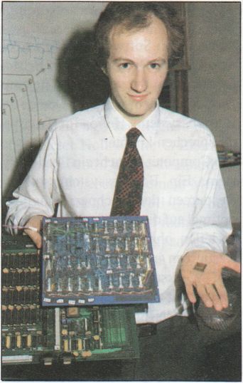 Chip-Designer R. Miller zeigt stolz den neuen Blitterchip für den Transputer. In der rechten Hand ein Prototyp des Blitters.