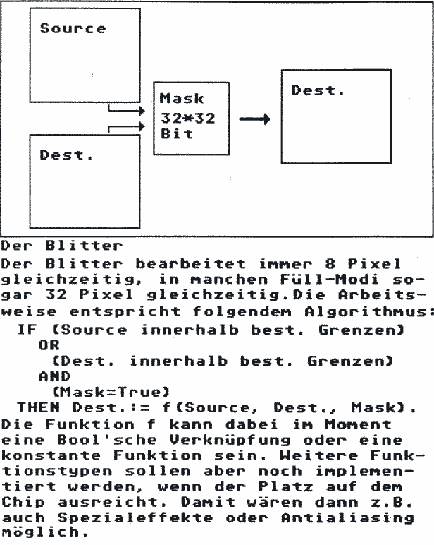 Auch Hardware-Panning und Zooming ist möglich. Sogar gewisse Formen von Anti-Aliasing sollen vom Blitter hardwaremäßig unterstützt werden. Leider wurde über diesen extrem wichtigen Punkt noch nichts näheres verraten. Ein spezielles Blittermanual ist aber in Vorbereitung und sollte bei Erscheinen dieses Artikels lieferbar sein (bei ATARI England). Eine Grafik-Library für den Blitter soll auch bereits in Arbeit sein. Nach allem was bisher bekannt wurde, ermöglicht der Blitter aber wirklich bombastische Grafikleistungen im 2D-Bereich (Der Autor litt während der ‘Fragestunde’ an schweren Enthusiasmus-Anfällen).