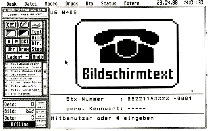 Man kann den Btx-Manager aber auch als reinen Softwaredekoder betreiben. âDie Post toleriert das inzwischen, weil sie eingesehen hat, daĂ Computerbesitzer diejenigen sind, die sich als erste ans Btx-Netz anschlieĂen lassen. Und Störungen kann es dadurch ja nicht geben, weil das analoge Postnetz und das digitale Computernetz an der Btx-Box getrennt werden.â Diese Box braucht jeder Btx-Neuling (65 Mark AnschluĂkosten, 8 Mark Monatsmiete), da sie die notwendige Identifikationsprozedur bereitstellt.