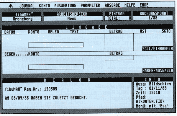 Blättern in Listen/Suchen nach Datensätzen: Neues Bildschirmlayout mit Überschriften in allen Bildschirmlisten mit der Option der Datensatzauswahl mittels durch die Cursortasten zu steuerndem invertierten Balken. Hiermit ist z.B. die Auswahl von Konten nicht mehr nur durch die Kontonummer, sondern durch einfaches Daraufzeigen im Kontenplan möglich. Dies entlastet das Gedächtnis enorm, so daß man sich voll auf die eigentlichen Buchungen konzentrieren kann.