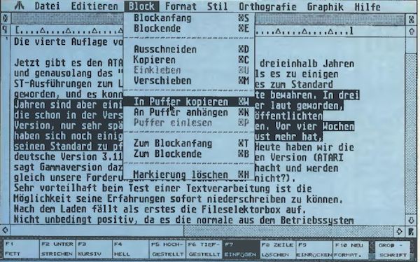 Aber immerhin hat sich etwas bei den Blockoperationen getan. Ein Block wird nun nicht mehr mit einer aufzuziehenden Box markiert, sondern, wie in den meisten Programmen, die Blöcke unterstützen, wird mit gedrückter linker Maustaste über den zu markierenden Bereich gefahren. Die Darstellung als Block geschieht auch gleich, auf meinem Monitor in inverser Schrift. Mit dieser Art der Blockmarkierung ist es nun auch möglich, das Blockende und den Blockanfang beliebig auf dem Monitor zu plazieren. Sollte der zu markierende Block nicht auf eine Bildschirmseite passen, kann das Blockende bzw. der Blockanfang auch durch Doppelklick auf die gewünschte Position markiert werden. Leider sind immer noch keine spaltenorientierten Blöcke zu markieren, mit denen es dann möglich wäre, mehrspaltigen Satz zusammenzuflicken.
