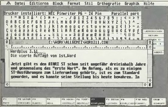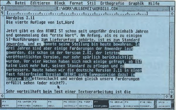 Alles im allem hat 1st_Wordplus 3.11 doch eine erhebliche Aufwertung gegenüber seinem Vorgänger erhalten, auch wenn viele Wünsche nicht erfüllt wurden. Vor allem die Arbeit mit den Tastenkommandos macht sehr viel Spaß. Kleinere Fehler, wie teilweise oben erwähnt, wurden oder werden behoben. Daß die Ausgabe nicht sonderlich schneller geworden ist, liegt an der konsequenten Nutzung der GEM-Routinen mit allen Vor- und Nachteilen. Immerhin bietet Wordplus 3.11 einen deutlich größeren Leistungsumfang, ohne etwas am Konzept geändert zu haben. Und das erneute Studium des Handbuches ist auch nicht nötig, so daß der Austausch alt gegen neu ohne größere Probleme vonstatten geht. Von ATARI Deutschland wurde uns mitgeteilt, daß die neue Version 3.11 (entgegen anders lautender Meldungen) voraussichtlich erst nach der CeBIT ’89 Ende März ausgeliefert werden wird.