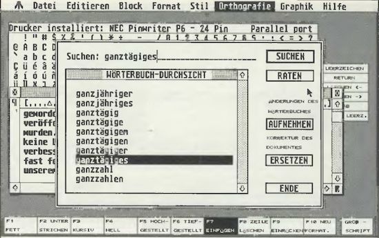 Die langen Ladezeiten des Wörterbuches und die anschließende Dekomprimierung haben in der alten 2.02-Version die meisten Anwender abgehalten, diese Option zu nutzen. In der neuen ist bei den Ladezeiten eine deutliche Geschwindigkeitsteigerung zu beobachten (nur knappe 2 Minuten), und der erhebliche Zeitaufwand die Datei zu dekomprimieren, entfällt völlig. Daß ein Text nun auf Tastendruck auf Fehler bzw. auf unbekannte Worte hin untersucht werden kann, und daß die so gefundenen Wörter mit einer Tastenkombination ins Wörterbuch zu übernehmen sind, macht diese Funktion doch erheblich attraktiver, und vielleicht greift jetzt auch der eine oder andere darauf zurück. Gleichfalls werden jetzt getrennte Worte als solche erkannt und nicht mehr als zwei unbekannte gewertet.