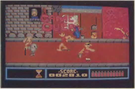 “Rainbow Arts” stand auf dem Ansteckbutton, der mir beim Öffnen der Verpackung von Graffiti Man entgegenplumpste. Ich spießte die Nadel an meine Brust und stopfte die Diskette ins Laufwerk. Zur Begrüßung spielt der ST eine spritzige Titelmelodie, und dann geht es auch schon in die Welt der Spraydosenkünstler. Der Spieler übernimmt die Rolle von Mickey, der in einem öden Viertel voller Betonbaracken lebt. Überall, wo Mickey hinsieht, erblickt er grauen langweiligen Beton (Gähn!) “Den müßte man ein bißchen veredeln”, denkt Mickey, schnappt sich Spraydosen inklusive Farbe und begibt sich auf die gefährliche Straße. Dort lauem viele Gefahren für Burschen mit Spraydosen in der Hand. Spießbürger und vor allem die Polizei hassen Jungs, die die Wände mit irgendwelchem Schmierkram vollsprühen. Da werfen Omas mit Blumentöpfen, Opas schlagen mit dem Spazierstock, rücksichtslose Skateboardfahrer mähen Mickey über den Haufen, und bitterböse Polizisten schlagen mit dem Gummiknüppel um sich. Ihre Aufgabe besteht darin, Mickey von links nach rechts über die Straße zu steuern und allen wilden Attacken der bösen Spießbürger auszuweichen. Wehren können Sie sich nicht. Treffen die Passanten Mickey mit Nudelhölzern oder anderen neckischen Gegenständen, verlieren Sie Energie in Form von kleinen Spraydosen, die am rechten unteren Bildschirmrand zu sehen sind. Läuft ein wilder Spießbürger Sie über den Haufen, verlieren Sie gar ein Bildschirmleben. Also aufpassen! Haben Sie das Ende einer Straße erreicht, wechselt das Szenario. Jetzt wird nicht mehr mit dem Joystick, sondern mit der Maus gesteuert. Per Maus bewegen Sie eine kleine Spraydose über den Bildschirm. Sprühen Sie das einfarbige Graffiti nach, das der ST Ihnen vorgibt, denn das bringt Punkte. Ist der Farbvorrat verbraucht, geht es wieder über eine Straße voller Gefahren. Natürlich sehen Straße und Spießbürger im jedem Level anders aus. Graffiti Man ragt aus dem Gros der Computerspiele durch eine originelle Idee heraus. Mit einer flüssigeren Animation, einer weniger zähen Steuerung, einem hörenswerten Sound während des Spiels, mehr Möglichkeiten für den Spieler in den Straßenszenen zu agieren, wäre Graffiti Man ein Hit. So bleibt es nur schwach durchschnittliche Softwarekost.