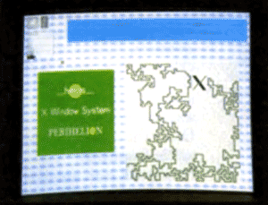 Unter X läßt sich der Bildschirmhintergrund beliebig einstellen. Hier ein Helios-Logo als Muster. Rechts die X-Demo 'Labyrinth', der Rechenschieber oben erscheint, wenn man das X-Taschenrechner-Programm mit der Option 'analog' aufruft.