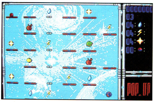 Nach dem phĂ€nomenalen Erfolg von âTetrisâ und âArkanoidâ besinnen sich immer mehr Hersteller auf simple Spielprinzipien. DaĂ dabei bisher ebenso schlichte wie schlechte Software entsteht, beweist âPop Upâ auf erschreckende Weise. In Gestalt eines quicklebendigen Gummiballs hat der Spieler fĂŒnf Epochen aus jeweils vier Spielabschnitten zu durchhĂŒpfen. Dies geschieht, indem er alle GegenstĂ€nde innerhalb eines Bildes aufsammelt und sich anschlieĂend zum Ausgang begibt. So weit - so simpel. TĂŒren, Blockaden und unĂŒberwindbare FeuerwĂ€nde sollen den Schwierigkeitsgrad erhöhen, sind mit entsprechenden SchlĂŒsseln oder einer Ladung Wasser aber keine ernstzunehmenden Hindernisse. Einzig und allein die schrĂ€ggestellten Plattformen bereiten Probleme. Einmal berĂŒhrt, versetzen sie die Kugel in einen unkontrollierbaren Taumel. Da 20 Levels nicht gerade ewig vor den Bildschirm fesseln, haben die Programmierer freundlicherweise an einen Editor gedacht. Der einzige Motivations-Lichtblick! Highscore-Liste, Team-Modus oder PaĂwortsystem sucht man vergebens. Jedes Level erinnert auf frappierende Weise an das vorhergehende. Ebenfalls langweilig stimmt die Tatsache, daĂ es nur einen sinnvollen Ausgang zum nĂ€chsten Level gibt. Programmiertechnisch gesehen, ist âPop Upâ nicht gerade ein achtes Weltwunder: die Hintergrundgrafiken in biederer EGA-QualitĂ€t wirken verwaschen und lassen nur undeutlich den jeweiligen Zeitabschnitt erkennen. Auch der Sound ist keinen Deut besser. Wer ihn zu lange hört, kratzt vor Ohrenschmerzen die Tapeten von den WĂ€nden. Zugegeben: âPop Upâ ist kinderleicht, leicht spielbar - man braucht auch keine dicken AnleitungsbĂŒcher zu wĂ€lzen, um das Game zu kapieren. Aber auf die Dauer wird Infogrames neues Geschicklichkeitsspiel zum Schlafmittel.