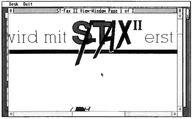 Die Installation des Empfangs-Accessorys erweist sich als problemlos. Wer allerdings keinen ACC-Eintrag mehr frei hat, muß sich von einem der nützlichen Helfer trennen. Das Fax-Empfangs-Accessory läßt sich leider nicht in Multi-Accessories (z.B. Chameleon oder Multidesk) verwenden. Man kann aber das. ACC in .PRG umbenennen und es so als ganz normale GEM-Anwendung starten. Dann ist der Rechner allerdings immer durch das Programm blockiert! Als Accessory installiert, wacht das Programm fortan im Hintergrund über die serielle Schnittstelle und tritt in Aktion, sobald das angeschlossene Modem einen Fax-Empfang meldet. Ein eingegangenes Fax wird in einer Datei auf Diskette oder Festplatte abgelegt, wobei eine Festplatte sehr zu empfehlen ist, da es zeitweise Vorkommen kann, daß die eingehenden Fax-Daten schneller ankommen, als sie auf ein normales Diskettenlaufwerk abgelegt werden können. Zur Not sollte man in diesem Fall eine RAM-Disk installieren und den Pfad für eingehende Faxe entsprechend ändern. Leider wird der Computer während des Fax-Empfangs für den Anwender gesperrt. Er muß sich also gedulden, bis die Übertragung beendet ist. Mit Hilfe des Hauptprogrammes von ST-Fax II ist es nun möglich, die Fax-Datei zu laden, auf dem Bildschirm darzustellen oder auf einem Drucker auszudrucken. Die Auflösung von maximal 200x200 DPI läßt sich aber mit dem Phonic-Modem nicht erreichen. Es können zwar Faxe mit 200x200 DPI versendet werden, der Empfang findet aber grundsätzlich in der niedrigeren Auflösung von 200x100 DPI statt. Für Texte, Grafiken oder einfache technische Zeichnungen ist dies aber ausreichend. Die spezielle Fax-Datei läßt sich auch in das GEM-übliche .IMG-Format konvertieren. Damit sind dann alle Möglichkeiten offen, um das Fax in Grafikprogrammen wie z.B. Arabesque weiterzubearbeiten. Wer nur einen Telefonanschluß hat, kann diesen ebenfalls für normale Gespräche nutzen. Das Accessory schaltet für diesen Fall den Fax-Empfang ab, so daß das Modem nicht von selbst abhebt, sondern der Anwender dies vom Computer aus steuern kann. Natürlich muß er dann zunächst selbst „horchen“, ob ein normaler Anruf oder ein Fax ins Haus steht.