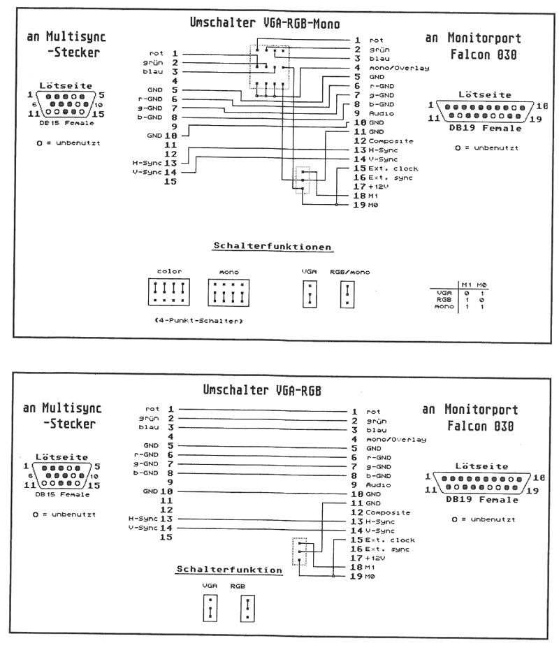 Damit der Falcon sich orientieren kann, was denn überhaupt für ein Monitor angeschlossen ist, existieren 2 Pins am Monitorausgang (18:M1 und 19:M0), die je nach angeschlossenem Monitor einen anderen Pegel besitzen. Ein Kontakt mit Masse bedeutet dabei logisch Eins und kein Kontakt logisch Null. Wenn also kein Monitoradapter aufgesteckt ist, liegen beide Pins nicht an Masse, und M1, M0 haben beide den Wert Null, woraus der Falcon auf einen Fernsehanschluß schließt. Die anderen Möglichkeiten können Sie der Tabelle entnehmen. Es stellt sich nun die Frage, wie man seinem Falcon beibringen soll, daß er trotz angeschlossenen VGA-Monitors RGB-Signale liefern soll, wenn der Anwender das wünscht. Die eine Möglichkeit besteht darin, sich softwaremäßig in die entsprechenden XBIOS-Aufrufe [ 1 ] einzuhängen und selber dafür zu sorgen, daß die 2 Pins anders interpretiert werden, was aber nicht sehr sauber ist, da das TOS selber diese Aufrufe nicht benutzt und statt dessen direkt auf undokumentierte Variablen zugreift. Auch das Vortäuschen eines SM 124 würde nicht klappen, da dann die Videosignale über einen anderen Pin gesendet würden, der im VGA-Adapter nicht berücksichtigt wird. Die andere Möglichkeit besteht darin, sich einen eigenen Adapter zu löten, der mit Hilfe von Schaltern in Lage ist, die Ml-, M0-Pegel selbst zu ändern und auch das Monochromsignal richtig weiterzuleiten.