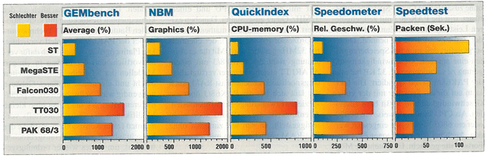 Wir haben für unsere Geschwindigkeitstests mit der PAK68/3 natürlich die gleichen Programme herangezogen wie bei den Turbo-Boards aus dem Test im letzten Heft. Sie können die Werte also direkt vergleichen. Der Übersicht halber haben wir in den Grafiken noch einmal die Ergebnisse der originalen ATARI-Rechner (ST, STE, TT und Falcon030) mit aufgenommen. Man erkennt deutlich, daß die PAK68/3 meist knapp an die Leistungen des TTs herankommt, manchmal sogar etwas schneller ist. Eine weitere Leistungssteigerung kann wohl durch den Einsatz eines 50MHz-68030 mit einem entsprechenden 50MHz-Takt erreicht werden. Das Board soll diese Taktfrequenz angeblich klaglos mitmachen. Leider konnten wir dies bislang nicht testen. Mit 50MHz wäre die PAK68/3 sicherlich deutlich schneller als ein TT.