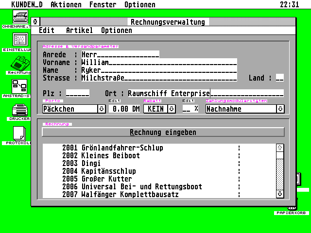 Der Kundendirektor ist vollständig in GEM eingebunden, wobei die Oberfläche mit dem ACS erstellt wurde, was dem Komfort und der Integrität sehr zugute kommt. Auch gibt es mit höheren Auflösungen und Multitasking-Erweiterungen keinerlei Probleme und die Dialoge sind größtenteils nichtmodal, so daß ein sehr angenehmes und schnelles Arbeiten möglich ist.