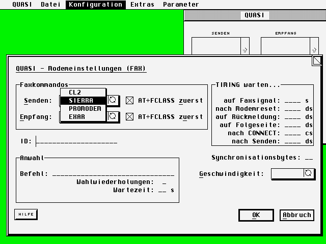 Quasi bietet eine bequeme Konfiguration von QFax über GEM-Dialogboxen. Für verschieden Anwendungsfälle bietet Quasi eine schnelle Auswahl aus bis zu 5 verschiedenen Konfigurationen. Diese sind per Funktionstaste erreichbar. Wichtig für viele ist die Gebührenberechnung, und natürlich darf ein Telefonbuch nicht fehlen. Mußte man beim Original-QFax noch zwischen den Programmen wechseln, indem man das eine verließ und das andere aufrief, so übernimmt dies nun Quasi als Shell. Ein Druck auf einen Button, und schon ist man im gewünschten Programm. Zusätzlich kann ein externer ASCII-Editor gewählt werden, mit dem sich dann mal auf die Schnelle ein paar Zeilen tippen lassen, um diese schnell zu versenden. Ist Quasi installiert, kann der Empfang überwacht und auf Wunsch automatisch ausgedruckt werden. Dadurch kann das heutzutage immer noch teure Echtpapierfax eingespart werden. Leider funktioniert dies noch nicht unter MultiTOS. Für Speedo-Freunde sei noch gesagt, daß diese Fonts sowohl bei der Bildschirm- als auch bei der Druckerausgabe benutzt werden können.