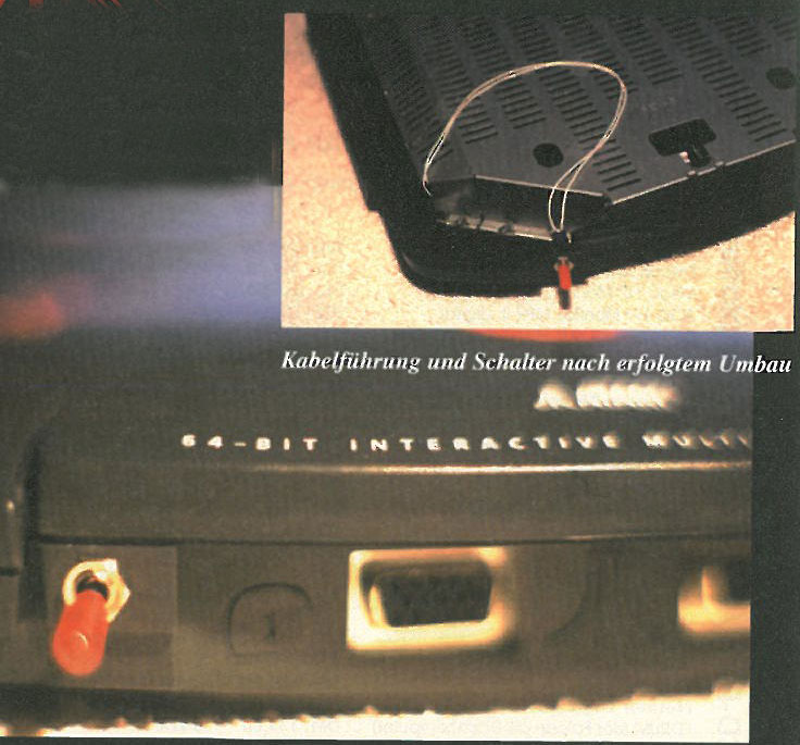 Ist alles in Ordnung, wird die Platine mit dem Abschirmblechunterteil wieder aus dem Gehäuseunterteil genommen und das Oberteil des Abschirmblechs aufgesetzt. Dabei werden zunächst die beiden Kabel an der linken Seite durch den Schlitz des oberen Abschirmblechs zwischen der zweiten und dritten (vom Joypadport gezählt) unteren Befestigungslasche nach außen verlegt und dann alle Laschen wieder zugebogen. Als nächstes muß im Gehäuseunterteil ein Loch von ca. 5mm (je nach verwendetem Schalter) gebohrt werden. Hierzu bietet sich der kleine, schon etwas hervorgehobene Gehäuseteil neben dem Joypadport 1 (siehe Titelbild) an. Zuerst bohrt man dort mittig ein Loch von 3,5mm und erweitert dieses anschließend mit dem 5mm-Bohrer. Zum Entgraten wird der 6mm-Bohrer kurz an der Lochkante angesetzt. Der Abschirmblechkäfig kann nun wieder in das Gehäuseunterteil eingesetzt und mit den vier Schrauben mit diesem verschraubt werden. Der Schalter wird in die Bohrung eingesetzt und verschraubt. Dabei reicht eine Mutter, ohne Scheiben, völlig aus. Sollte der Schalter nicht sauber durch das Loch gehen, liegt es daran, daß das Schaltergehäuse innen mit der dortigen Gehäusekante kollidiert. Diese Kante muß dann sehr vorsichtig und langsam (man will ja kein zusätzliches unschönes Loch in seinem Jaguar) mit dem Lötkolben abgetragen werden, bis das Schaltergehäuse an der Gehäuseinnenwand anliegt und das Gewinde richtig durch das Loch geht. Dieser Vorgang sollte wirklich sehr vorsichtig und lieber in mehreren Schritten stattfinden.