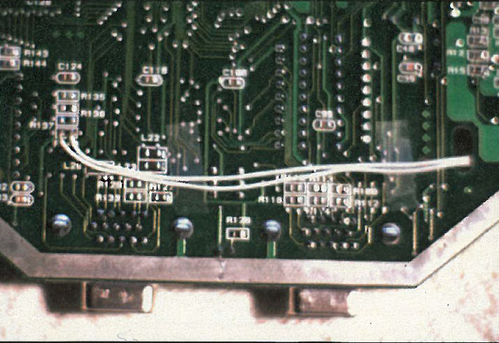 Hat man diesen erfolgreich lokalisiert, muß man den dort befindlichen OD-SMD-Widerstand entfernen. Aber Achtung, dieser ist außer durch die beiden kleinen Lötungen noch durch einen Tropfen Lack fixiert. Am besten erhitzt man eines der beiden Lötaugen und versucht, wenn das Lötzinn dort flüssig geworden ist, den Widerstand mit der Lötspitze oder einem kleinen Schraubendreher vorsichtig ein kleines Stück hochzubiegen. Dabei ist zu beachten, daß man das Lötauge nicht zu lange erhitzt und den Platinenkontakt beim Hochbiegen nicht abreißt. Hat man das erfolgreich geschafft, ist der schwerste Teil der Arbeit auch schon erledigt.