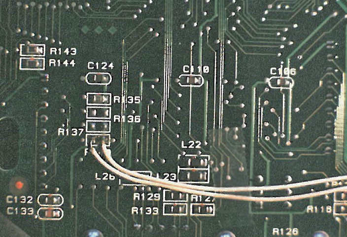 Als nächstes muß man den Jumper R140 auf der Platinenunterseite lokalisieren. Dazu sucht man links, oberhalb des linken Joypadports eine Reihe von fünf untereinanderliegenden Jumpern. Die obersten beiden und der unterste davon sind bestückt, und genau der unterste ist der gesuchte Jumper. Er trägt bei „älteren“ Jaguar-Konsolen die Bezeichnung R140, während bei neueren PAL-Geräten die Beschriftungen auf der Unterseite fehlen.