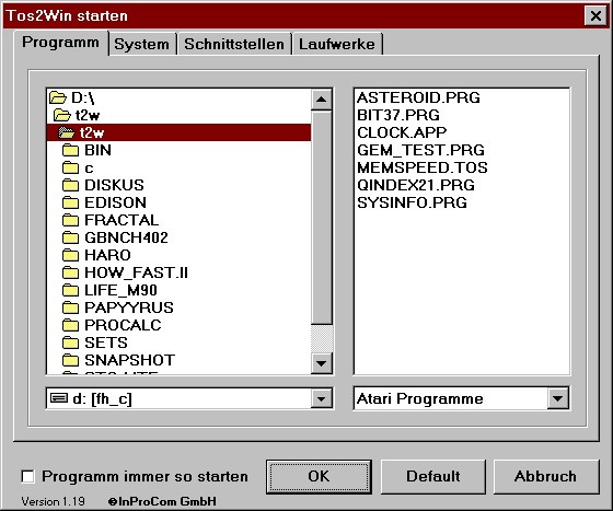 Wenn Sie TOS2WIN direkt starten, wird es sich immer mit dem Verzeichnis melden, das Sie eingestellt hatten, als Sie zuletzt auf den Default-Button gedrückt haben. Sie können mit dem Fileselektor beliebig auf Ihrem Computer oder sogar in einem Netzwerk (falls Ihr Computer vernetzt ist) herumwandern.