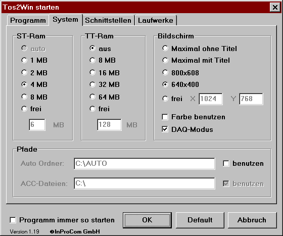 Sobald Sie den OK-Button klicken, wird das ausgewählte ATARI-Programm mit den von Ihnen gewählten Voreinstellungen gestartet. Falls Sie den Schalter Programm immer so starten aktiviert haben, werden die Einstellungen zusätzlich in einer T2W-Datei abgespeichert, die den gleichen Namen wie das ausgewählte Programm hat. (Als Endung wird dann aber T2W verwendet.)