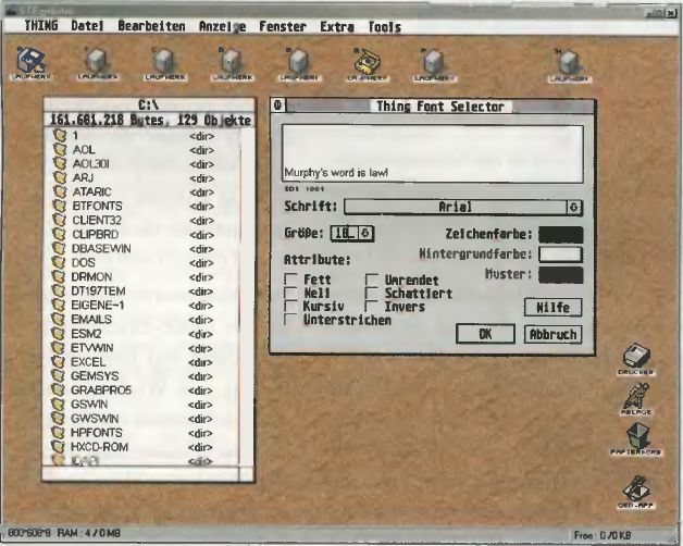 Alles in allem erweist sich Thing als die optimale Ergänzung zum Stemulator, denn neben der Frage der modernen Optik enthält Thing eine Reihe von Funktionen, die das tägliche Arbeiten mit Atari-Software mindestens ebenso modern und komfortabel gestalten wie das Arbeiten mit Windows-Systemen. Wenn Sie z.B. den Font für die Darstellung in den Fenstern verändern wollen, öffnen Sie einfach die Fontauswahl-Box von Thing, suchen sich einen Font aus und ziehen diesen mit Hilfe der Maus lediglich auf ein geöffnetes Fenster (siehe Titelbild 1).