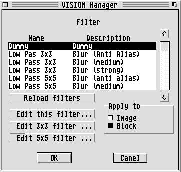 Die Filter von Vision sind auf den True Color-Modus beschränkt. Zur Auswahl steht dabei Verwischen ("Blur"), Scharfstellen und Ecken herausstellen in allen Geschmacksrichtungen. Die dadurch erzielten Effekte sind zwar nicht mit Smurf zu vergleichen aber trotzdem ganz nett. Die Filtermatrix jedes Filters lässt sich verändern, auch neue Filter können hinzugefügt werden.