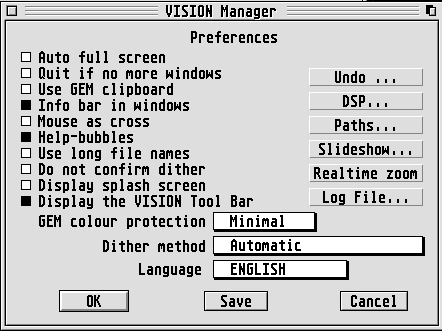 In den Voreinstellungen von Vision finden sich einige interessante Optionen. So scheint es erst, das Vision keine langen Dateinamen unterstützt. Diese Unterstützung ist aber einschaltbar, genauso wie das GEM-Clipboard. Falcon-Besitzer wird es freuen, das optional der DSP benutzt werden kann, womit sich die Arbeitsgeschwindigkeit erhöht. Ein weiteres interessantes Feature ist die Log-Datei.