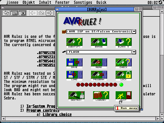 Das Programm präsentiert sich GEM-konform in einem Fenster. Auf den zweiten Blick gibt es jedoch bei AVR Rulez einige unschöne Details. Das Programm zeichnet innerhalb des Fensters einen zweiten, dicken Rahmen, mit dem das Fenster verschoben werden kann. Unter MagiC wäre dies jedoch unnötig und auch sonst sollte das GEM nicht auf diese Weise „erweitert“ werden. Die Listboxen sehen ebenfalls eher ungewohnt aus. Auch für BubbleGEM hat der AVR Rulez-Programmierer (bzw. der Programmierer der verwendeten GEM-Library) eine eigene Lösung interpretiert - warum auch einen einfachen, leistungsfähigeren Standard unterstützen, wenn man eine Speziallösung programmieren kann...