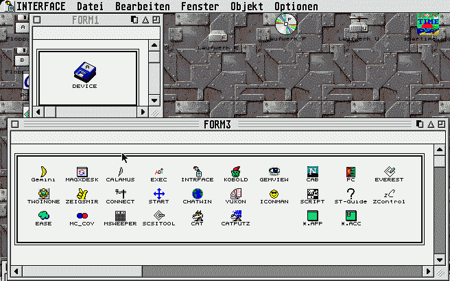 STIC benötigt beim Start das AES und gehört daher nicht in den Auto-Ordner. Am besten ist es im Start-Ordner von MagiC aufgehoben. Ist Stewart installiert und wird ein Neustart durchgeführt, werden erste Veränderungen sichtbar. Statt der MagiC-Recyclingpfeile erscheinen Icons, die zum laufenden Programm passen sollen. STIC orientiert sich dabei am Dateinamen der Anwendung. In der RSC-Datei von STIC ist im Text der Icons der passende Dateiname bzw. ein Teil dessen angegeben.