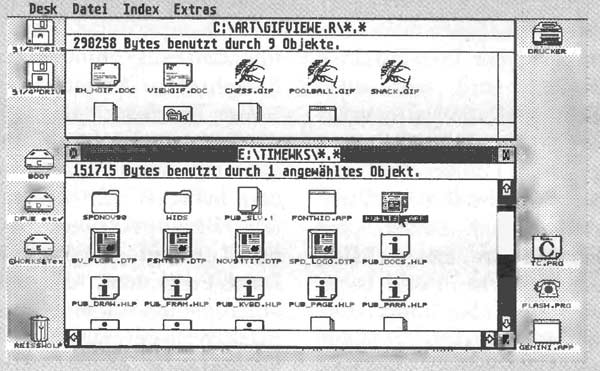 Das Aussehen der Icons können Sie über einen Menüeintrag einstellen. Eine Auswahl verschiedener Symbole ist im ROM schon enthalten. Erweitern können Sie sie, indem Sie eine Datei »DESKIC ON.RSC« mit einem Resource Construction Set auf Ihrer Bootpartition anlegen. Dann stehen Ihnen nach dem Start sämtliche darin enthaltene Bilder zur Verfügung. Eine solche Datei befindet sich auf der beigefügten Diskette.