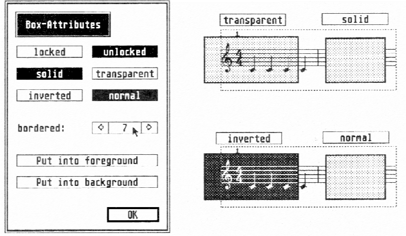 Leider kann Masterscore II keine Grafiken einlesen. Allerdings läßt sich diese Schwachstelle elegant umgehen: Masterscore verwaltet nämlich neben Noten-und Textrahmen noch Blank-Rahmen, die sich als Graurasterflächen mit verschiedenen Abstufungen darstellen lassen. Diese Rahmen haben einen variablen Rand. Damit sind auch völlig weiße Flächen möglich — als Platzhalter für Grafiken oder zum Überdecken unerwünschter Notentexte.