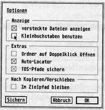 Zum Abschluß der Funktionsbeschreibungen möchten wir noch einmal hervorheben, daß sowohl die eigentliche Dateiauswahlbox, als auch die PopUp-Menüs vollständig per Tastatur bedienbar sind. Nur wenn Sie sich in einer der untergeordneten Dialogboxen befinden, z. B. beim Kopieren von Dateien, und Voreinstellungen ändern möchten, müssen Sie wieder zur Maus greifen.