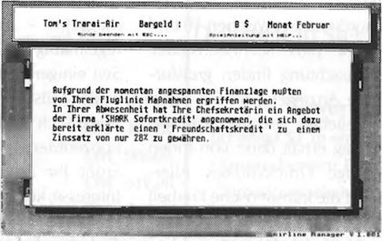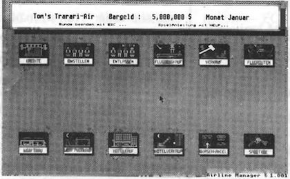 Ralf Diersen und Sebastian Däunert legen mit dem Public-Domain-Programm »Airline Manager« (Version 1.001) die spannende Simulation einer Fluggesellschaft vor, in der Sie als wohlhabender Unternehmer für das vertraute Klingeln in der Kasse sorgen müssen. Bis zu vier Spieler treten gegeneinander an. Wenn Sie alleine spielen, stellt der Computer einen ernstzunehmenden Gegner. Das Spiel geht über zwölf Runden (Januar bis Dezember). In jeder Runde tätigt der Spieler nach Belieben seine Aktionen. Zur Wahl über Icons stehen Flugzeuge an- und verkaufen, Terminals nutzen, Personal einstellen und entlassen, Flugrouten wählen, Hotelbeteiligungen an- und verkaufen und an die Börse gehen.