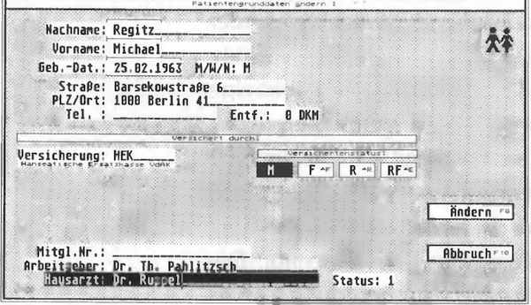 In unserem Falle war einer der wichtigsten Gründe die Übersichtlichkeit, welche die Atari-Systeme deutlich von den von uns getesteten IBM-Systemen abhob. Das Auffinden eines geeigneten Praxis-EDV-Systems für den Atari bereitete uns allerdings einige ungeahnte Schwierigkeiten: »LISA«, das der rührige Anbieter sofort zu Testzwecken zur Verfügung stellte, befand sich zum damaligen Zeitpunkt anscheinend noch in der Entwicklungsphase. Dies machte sich in permanenten Bombenwürfen bemerkbar. Die Firma PAM-Software verfügt nach eigenen Angaben ebenfalls über ein Praxissystem, lieferte jedoch auch nach mehrmaligem telefonischen Kontakt nicht einmal Informationsmaterial. Als dritter Versuch zeigte sich das Programm »Medic-PC« als sehr professionell und sicher lauffähig. Wir klammerten dieses System jedoch wegen hoher Kosten für das benötigte Netzwerk aus.