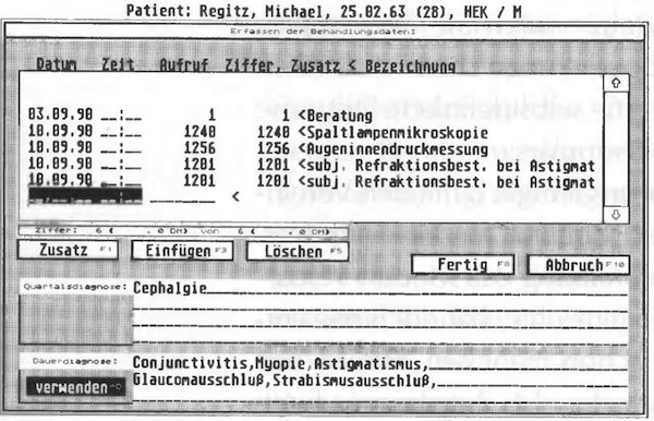 Trotz aller Vereinfachungen, die ein Komplettsystem zur Praxisverwaltung letztendlich bietet, ist die Umstellung auf EDV zeit- und arbeitsintensiv. Alle bisher aufgelaufenen Patientendaten in unserer Augenarztpraxis mußten wir am Bildschirm neu erfassen und die alten Karteien während dieser Periode weiterführen. Bei ca. 2000 Patienten pro Quartal ist der nötige Arbeitsaufwand leicht vorstellbar. Zumal sich die Praxis mit angeschlossener Tagesklinik nicht einfach schließen läßt. Wir beschlossen deshalb die Durchführung der notwendigen Arbeiten in drei Schritten. Von Anfang an sollten alle in der jeweiligen Phase nutzbaren Möglichkeiten von Hard- und Software zur Anwendung kommen: