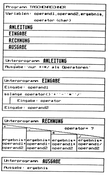 Auch das Programm TASCHENRECHNER (Listing 2) enthält einfache Prozeduraufrufe ohne Parameterübergabe. Man kann jedoch den Vorteil der Zerlegung eines Programmes in Module (bzw. Teile) sehr gut erkennen, denn das Hauptprogramm besteht nur noch aus den Anweisungen: