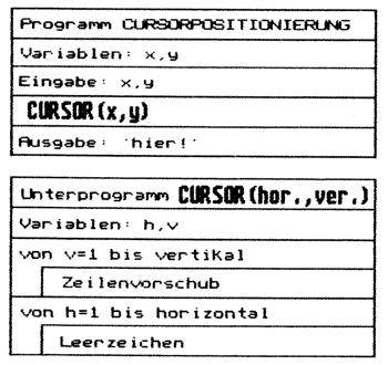 Das Programm CURSORPOSITIONIERUNG (Listing 3) zeigt die Übergabe von Parametern an eine Prozedur. Bei der Prozedurvereinbarung werden die Variablen 'horizontal’ und 'vertikal’ als Integer definiert. Das Hauptprogramm muß nun beim Aufrufen der Prozedur zwei Variablen des gleichen Datentyps übergeben. Der entsprechende Aufruf lautet: