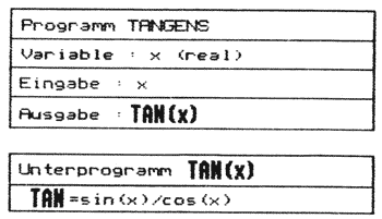Das Programm TANGENS (Listing 4) definiert die Tangensfunktion, die sonst in Pascal nicht vorhanden ist. Dabei ist sowohl der Parameter (x) als auch der Funktionswert vom Typ REAL. In Anweisungsteil der FUNCTION wird der Funktion ihr Wert zugewiesen:
