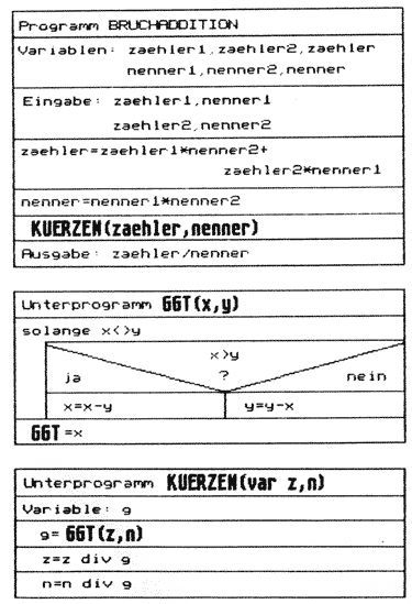 Als abschließendes Beispiel zu den Prozeduren folgt nun das Programm BRUCHADDITION (Listing 7). Es wird hier wieder die FUNCTION GGT eingesetzt und zusätzlich die PROCEDURE KUERZEN. Die Funktion wird von der Procedur aufgerufen und steht deshalb im Vereinbarungsteil vor dieser.