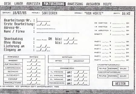 Erstmals auf der CeBIT 86 in Hannover vorgestellt, bietet seit kurzem die Firma BAVARIA-SOFT Datentechnik aus Feldkirchen bei München, das integrierte Softwarepaket BS-HANDEL für den klein- und mittelständischen Handel auf Atari ST Computer an.