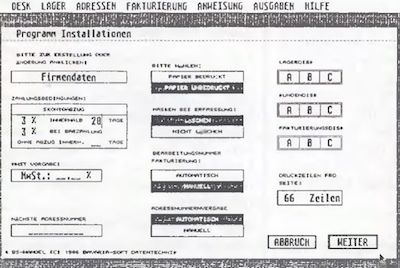 Man erwirbt mit BS-HANDEL ein richtiges Werkzeug, das man, wenn es einmal im Einsatz ist, nicht mehr missen möchte. Das Software-Paket wird mit einem ausführlichen, in Deutsch geschriebenem Handbuch, geliefert. Dieses verhilft schrittweise zum Einstieg. Das Programm wird von der Firma BAVARIA-SOFT auf Wunsch individuell angepaßt. Ebenso kündigt die genannte Firma für Ende Juli ein zu dem BS-HANDEL kompatibles FIBU-Programm mit gleichem Komfort und ähnlicher Leistungsfähigkeit an.