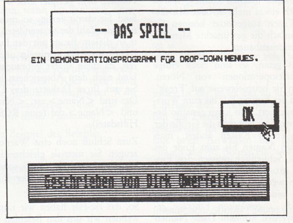 So, das Wichtigste ist geschafft. Aber was, wenn nun der Menüeintrag 'über dieses Spiel’ angewählt wird. Dann wollen wir aller Welt sagen, wer für dieses Programm verantwortlich ist, und das soll doch wohl zur Befriedigung unseres Egos möglichst schön aussehen. Also erzeugen wir einen zweiten Objektbaum von der Struktur FREE, die uns ein Rechteck zur freien Verfügung stellt. (Der einzige Unterschied zwischen FREE und MESSAGE besteht darin, daß MESSAGE noch gewisse Formatierungsregeln einhält, während man in FREE die Objekte absolut frei positionieren kann.)