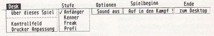 So benennen wir 'über dieses Spiel’ mit Hilfe der Name-Funktion des RCS als ABOUT, die 4 Spielstufen als STUFEI bis STUFE4, 'Sound aus’ als SOUND, 'Auf in den Kampf!’ als START und ’Zum Desktop’ als QUIT. Wie gesagt, diese Namen dienen nur dazu, im Programm den gewählten Eintrag zu erkennen, sie tauchen im fertigen Programm dann nicht mehr auf (wohl aber im C-Listing).