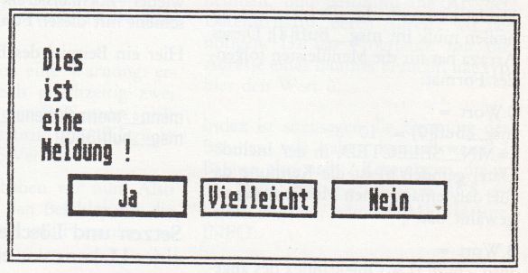Diese Funktion erzeugt eine Warnmeldung, wie sie in Abb. 1 zu sehen ist. In knöpf erhält man die Nummer des Knopfes, den der Benutzer angewählt hat. Die Nummer in return_knopf besagt, daß ein Knopf mit dieser Nummer auch durch die RETURN-Taste an wählbar ist und dick umrandet erscheint. (0 = kein Knopf, 1 = erste Knopf, usw.).