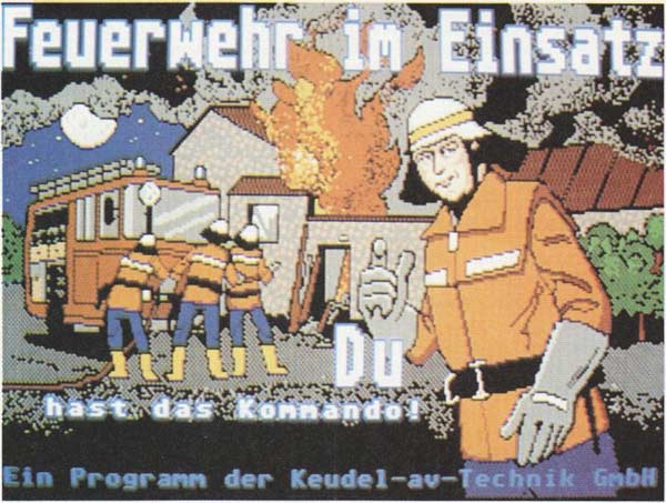 Unter dem Namen "Feuerwehr im Einsatz - Du hast das Kommando!" vertreibt die Keudel av-Technik GmbH ein Adventure-ähnliches Simulationsprogramm für Feuerwehrleute und die, die es gern werden möchten. Man kann das Programm natürlich auch als Laie nutzen. Allerdings muß man dazu die geltenden Feuerwehrvorschriften zu genüge beherrschen. Es gibt bei dem Programm drei Schwierigkeitsgrade, so daß man sich langsam hocharbeiten kann. Außerdem gibt es eine ewige Liste der besten "Feuerwehrmänner". Unter jedem Einsatzbild befindet sich eine Kurzbeschreibung der jeweiligen Situation. Sobald der Einsatzerfolg wegen kleiner Fehler oder zu langsamen Entscheidungen fraglich wird, beginnt der Cursor rot zu blinken. Grobe Fehlentscheidungen oder Verstöße gegen die Unfallverhütungsvorschriften führen zum "Kommandoentzug" und beenden die Simulation. Das Programm fügt sich nahtlos in eine Reihe weiterer Schulungsmittel der Keudel av-Technik GmbH ein. Geschrieben wurde es von der bekannten Firma ADVENTURE SOFT.