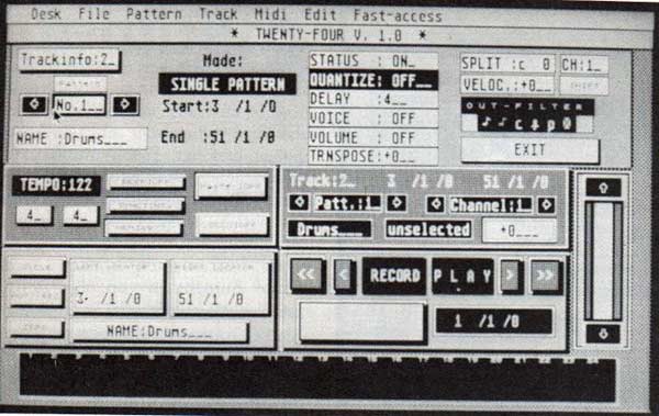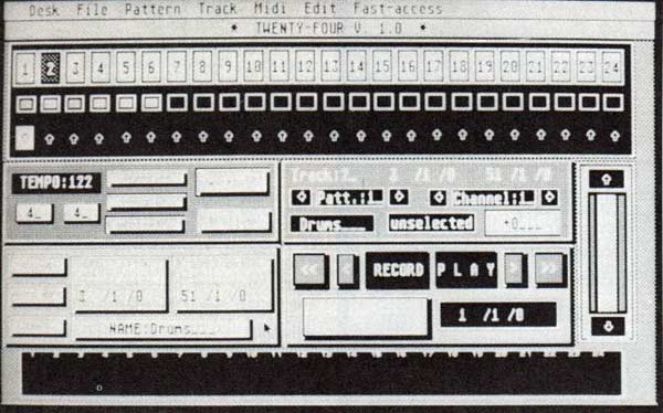 Das Steinberg Twentyfour ist also ein Programm, das den ST in einen solchen Sequencer verwandelt. Wie der Name des Programms schon sagt, handelt es sich hierbei um einen Sequencer mit 24 Spuren, das heiĂt, man kann maximal 24 polyphone Spuren nacheinander aufnehmen und dann zusammen wieder abspielen.