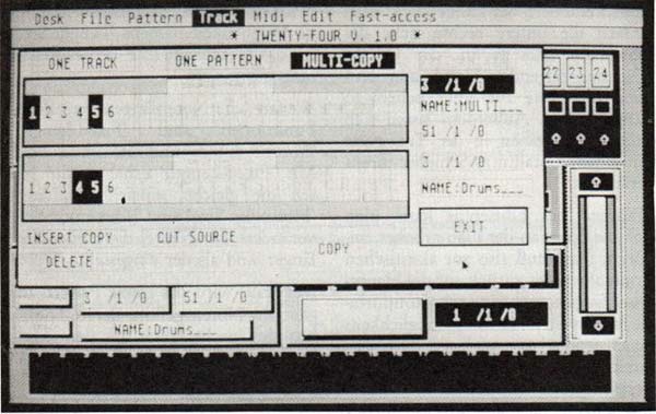 Die komplizierteste und mĂ€chtigste Kopierfunktion, die der Twenty four zu bieten hat, ist aber die âMulti-Copyâ-Option. Grob gesagt erlaubt sie so ziemlich alle Operationen, die man auch mit einem echten Tonband, Bandschere und Klebeband durchfĂŒhren könnte. Es kann also das imaginĂ€re Band geschnitten und wieder âzusammengeklebtâ werden, wobei leeres oder bespieltes Band eingefĂŒgt oder auch einfach ein StĂŒck Band herausgeschnitten werden kann. Diese Schneideoperationen können leider nur an Patterngrenzen durchgefĂŒhrt werden, ganz so flexibel wie mit Tonband ist man also bedauernswerterweise nicht. Es kann mit dieser Funktion aber auch einfach kopiert werden: man kann mehrere Spuren gleichzeitig kopieren, Teile mehrerer Spuren löschen und man kann mehrere Pattern gleichzeitig kopieren. Dazu ein Beispiel: man hat auf den Spuren 3, 4, 5, 7 und 23 einige Pattern aufgenommen und möchte sie an eine andere Stelle und auf andere Spuren kopieren (z. B. weil die Spuren am Bestimmungsort nicht alle frei sind). Als Copy-Source werden also die Spuren 3, 4, 5, 7 und 23 angegeben, zusammen mit dem gewĂŒnschten Bereich des Bandes (z. B. Start an Takt 4, Ende an Takt 8), als Copy-Destination die Spuren 6, 8, 9, 22 und 24 von Takt 324 an. Nach dem Kopiervorgang befindet sich ab Takt 324 auf Spur 6 eine Kopie von Takt 4-8 der Spur 3, auf Spur 8 eine Kopie von Spur 4, auf Spur 9 eine von Spur 5 und so weiter.