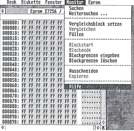 Auch das jetzt erhĂ€ltliche Betriebssystem (TOS) des ATARI ST ist in solche Bausteine einprogrammiert, nur daĂ hier das Glasfenster fehlt, da ein Löschen nicht vorgesehen ist. Verwendet man nun z. B. fĂŒr die von ATARI gelieferten ROMs EPROMs, so kann man sich mit Hilfe eines EPROM-Brenners (und dem nötigen Fachwissen) sein eigenes (verbessertes) Betriebssystem hersteilen. Aber auch ĂŒber den Modul-Port (Cartridge) können Programme aus EPROMs direkt geladen werden, ohne erst auf die Floppy zugreifen zu mĂŒssen.