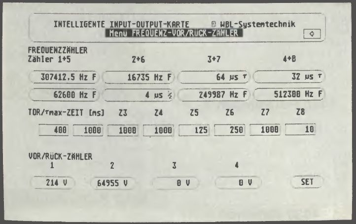 Selbst professionelle Industriekarten können in diesem Punkt kaum mit der ST-I/O-Karte mithalten. Es stehen in allen Versionen 8 Kanäle für Frequenz-, Periodendauer- und und Pulsbreitenmessung zur Verfügung. Weitere 4 Kanäle dienen als Vorwärts/Rückwärts-zähler. Frequenz-, Periodendauer- und Pulsbreitenzähler arbeiten mit 32 Bit Auflösung, d. h. Frequenzen können z. B. mit 91/2 Dekaden erfaßt werden. Alle Kanäle sind getrennt und unabhängig voneinander einstellbar. Torzeiten von 1 ms bis 16 s sind für die Frequenzmessung zulässig. Ist ein Kanal als Periodendauer- oder Pulsbreitenmesser geschaltet, so wird statt der Torzeit die maximale Perioden- (Puls-) Messzeit eingegeben, da bei dieser Einstellung von Flanke zu Flanke gemessen wird und ein vorzeitiges Meßende bei nur einer erkannten Flanke (Ausschalten der angelegten Frequenz) herbeigeführt werden muß. Periodendauer und Pulsbreiten werden mit einer Abtastrate von 1 us und einer maximalen Meßperiode von 232 us erfaßt. Die Vorwärts/Rückwärtszähler haben eine Kapazität von 2'6 Bit. Sie können auf einen beliebigen Wert gesetzt werden. Das mitgelieferte Demoprogramm stellt alle beschriebenen Funktionen übersichtlich und bedienerfreundlich dar.