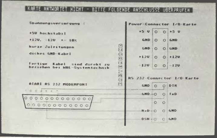 Die Installation der ST-I/O-Karte am ATARI ST gestaltet sich relativ einfach. Zu beachten ist, daß man den kompletten Kabelsatz zur Spannungsversorgung und Schnittstelle mitbestellt. Sollte kein Netzgerät mit den Versorgungsspannungen 5V, + 12V, - 12V zur Verfügung stehen, so kann auch dieses bei WBL-Systemtechnik bezogen werden. Nach Kontaktierung der nötigen Verbindungen kann das Programm auf der beigelegten Diskette gestartet werden. Ist die ST-I/O-Karte nicht korrekt angeschlossen, oder fehlt die Spannungsversorgung, so meldet sich daß Programm mit dem kompletten Verdrahtungsplan! (siehe Bild)