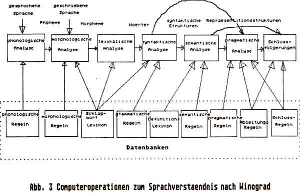 In diesen Bereich fallen die Anstrengungen zur maschinellen Übersetzung von Texten mit korrekter Grammatik. Es ist amüsant zu lesen, daß im sogenannten Gordon-Helmer-Bericht von 1964 [16] die Einführung solcher Programme bereits für 1978 vorausgesagt wurde. Der Hauptgrund für die unerwartet hohen Schwierigkeiten im Bereich der Sprachübersetzung liegt in der Mehrdeutigkeit menschlicher Sprache, die zu Mißverständnissen oder völligen Fehlinterpretationen führt. Der Standard-Demo-Satz 'Ich beobachte die Mädchen auf dem Hügel mit dem Fernglas’ ist ein Beispiel für die Mehrdeutigkeit menschlicher Sprache. Ein Meilenstein bei der Entwicklung von Software zur Spracherkennung stellt das 1972 von Terry Winograd veröffentlichte Programm SHRDLU zum Verständnis natürlicher (englischer) Sprache dar [18]. Eine ausführliche Beschreibung des in LISP geschriebenen Programms findet sich auch in dem Lehrbuch von C. M. Hamann [8]. Abb. 2 zeigt die Grundstruktur dieses Programms. Die angegebenen Programme sind miteinander vernetzt und rufen sich gegenseitig rekursiv auf. Allerdings beschränkt sich die Unterhaltung auf eine Bauklötzchenwelt, in der der Computer Klötzchen verschiedener Farbe und Form greifen und an anderer Stelle wieder absetzen kann. Es ist trotzdem verblüffend zu lesen, welch 'intelligente’ Unterhaltung sich zwischen dem Programm und dem Bediener ergibt [18]. Vom selben Autor stammt die [19] entnommene Abb. 3, die die zum Sprachverständnis erforderlichen Computeroperationen darstellt. In dieser Abbildung sind die verschiedenen Wissensbasen schraffiert. Die Implementation der dargestellten Programmteile ist noch keineswegs vollständig entwickelt. Dennoch zeigt der in [7] abgedruckte Musterdialog aus dem Hamburger Rede-Partner-Modell (FLAM-RPM) gegenüber SHRDLU ein erstaunliches Sprachverständnis und Alltagswissen. Allerdings bezweifelt Winograd, daß Computer die Aufgabe der sprachlichen Analyse jemals vollständig lösen können. Vielmehr sieht er in dem Computer ein nützliches, strukturiertes sprachliches Medium, also ein Werkzeug.
